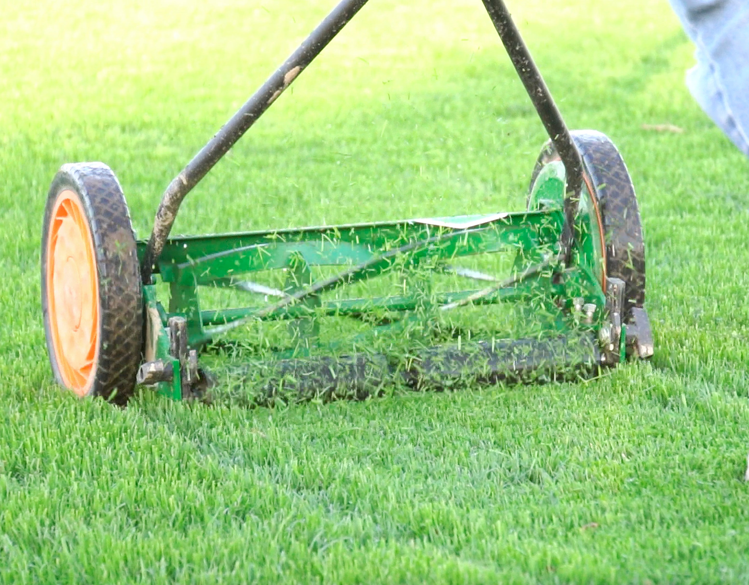 - Your first mow can occur with a light push mower when the grass reaches about 3.5-4” tall.