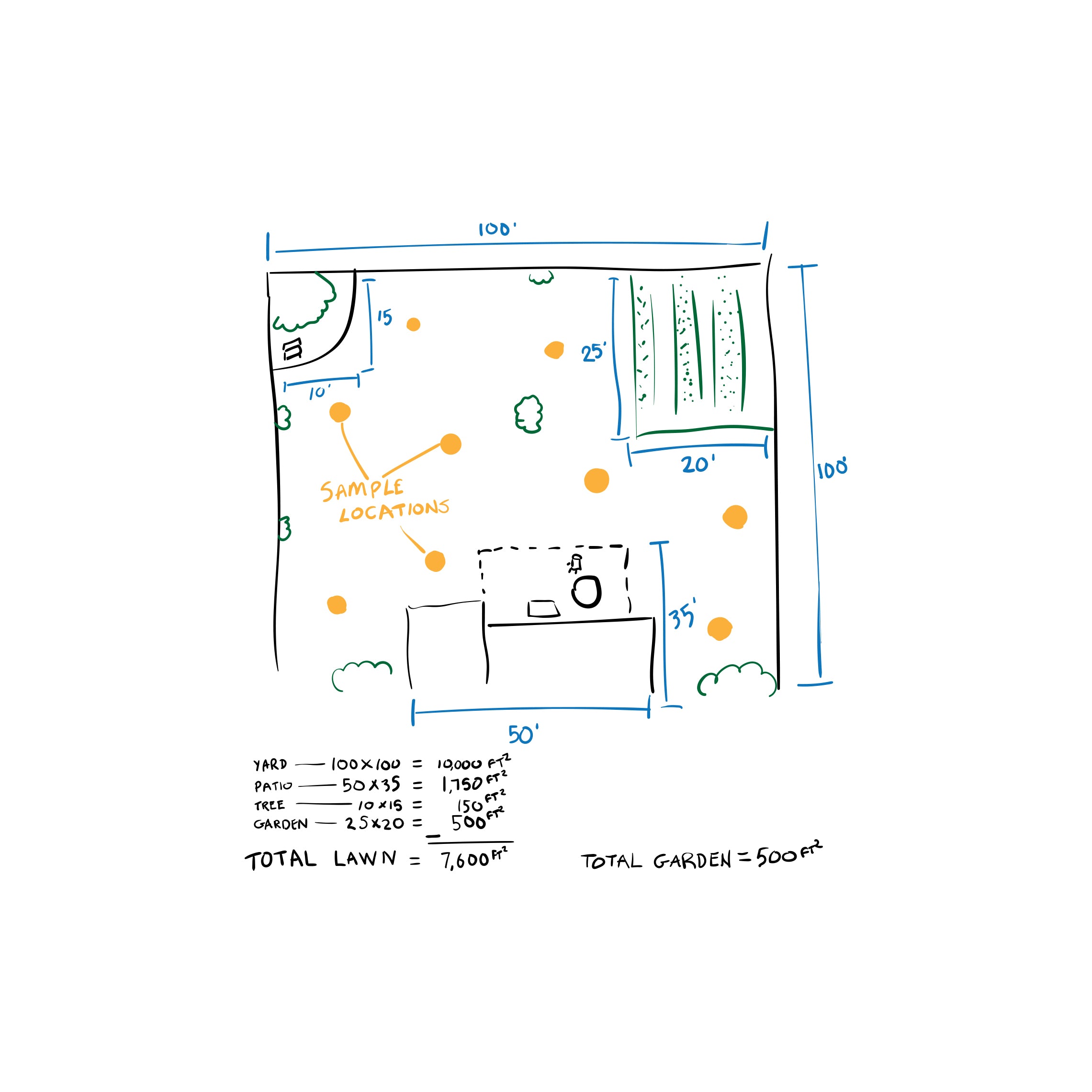 An accurate soil sample provides accurate analysis. Before taking your soil sample, it’s best to evaluate your testing area and divide it into different sections if needed. For example, the sketch shown is a homeowner’s backyard that wishes to collect samples for both a yard and garden. This example consists of a 7,600-square-foot lawn and a 500-square-foot garden.