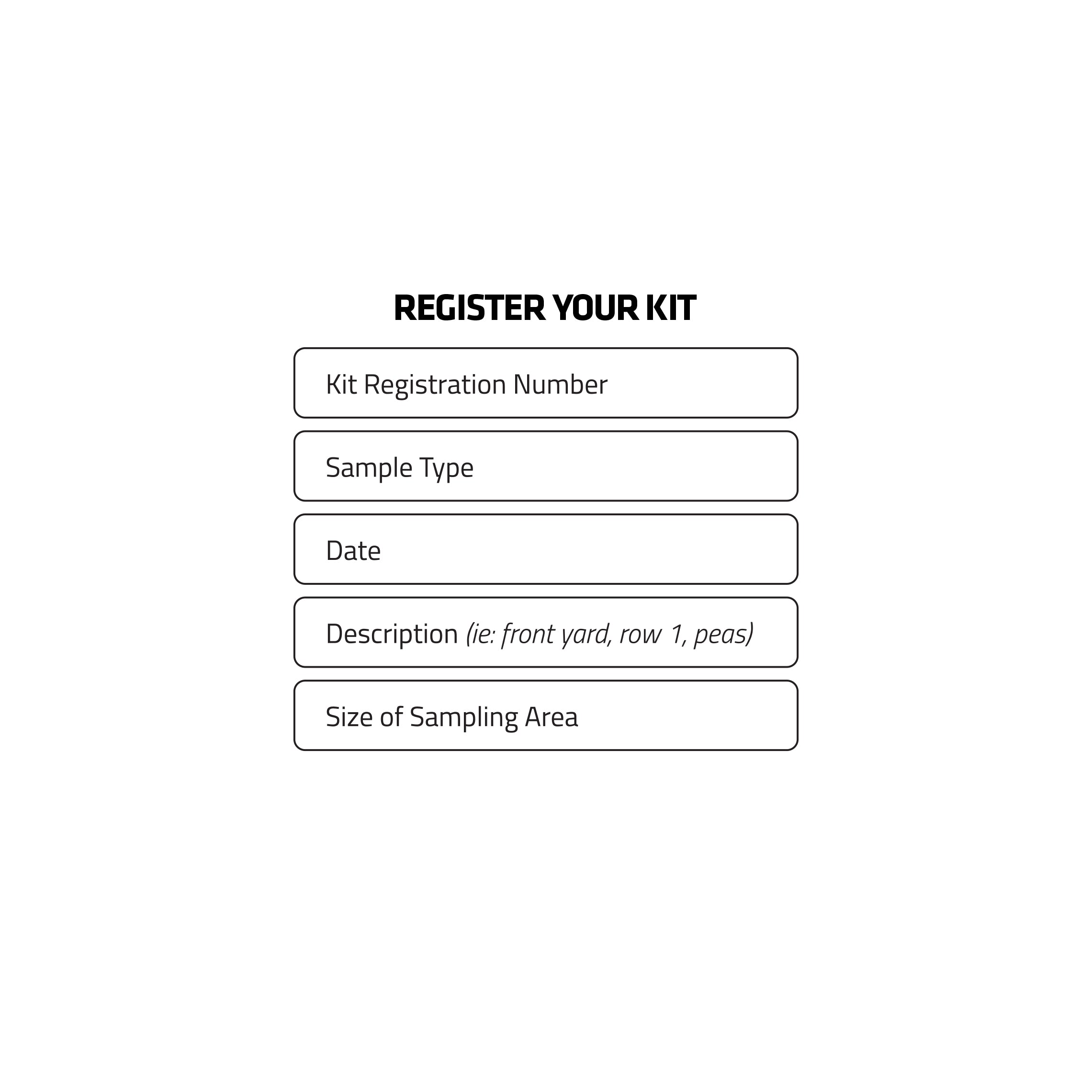 Enter your kit registration number. (Found on sample jar and paper insert.) Select the sample type: lawn, veg. garden, orn. garden, or trees Add the date of when your soil was added to the sample jar. Add an additional description of your sampling location for your reference. Select the approximate size (square feet) of your sampling area. (This is done by multiplying the length of the area by the width)