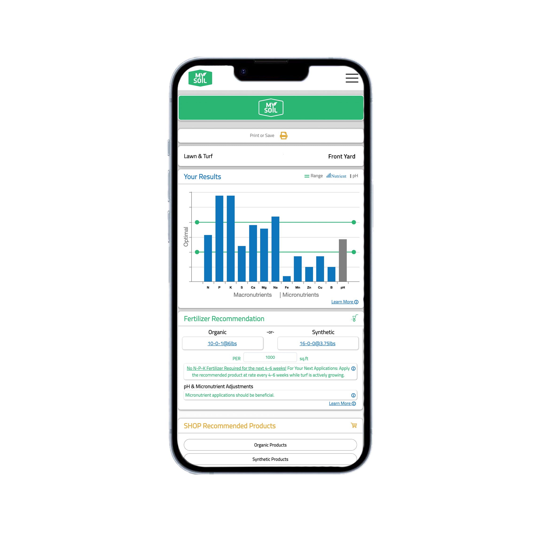This bar graph offers a quick overview of your soil analysis, highlighting nutrient levels and pH in relation to their optimal ranges.